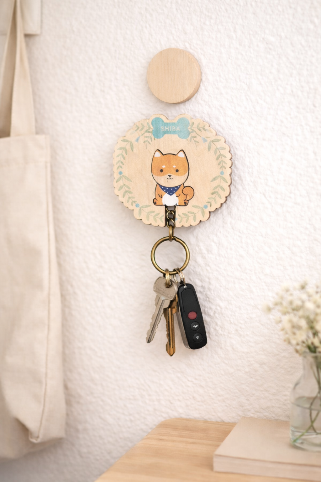 Unique wooden Shiba puzzle piece keychain slides into a wood wall mount that easily mounts on most walls and surfaces (includes 3M tape) so you never lose your keys in the house again!